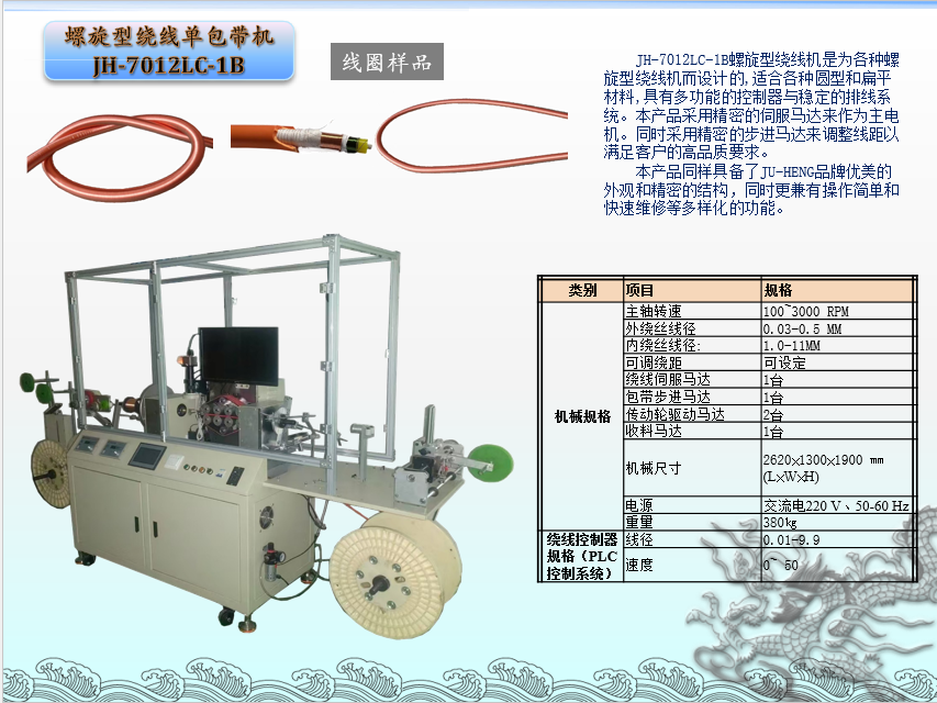 JH-702LC-1B螺旋型绕线机是为各种螺旋型绕线机而设计的,适合各种芯线的罗氏线圈,具有多功能的控制器与稳定的排线系统。本产品采用精密的伺服马达来作为主电机。同时采用精密的步进马达来调整线距以满足客户的高品质要求。
